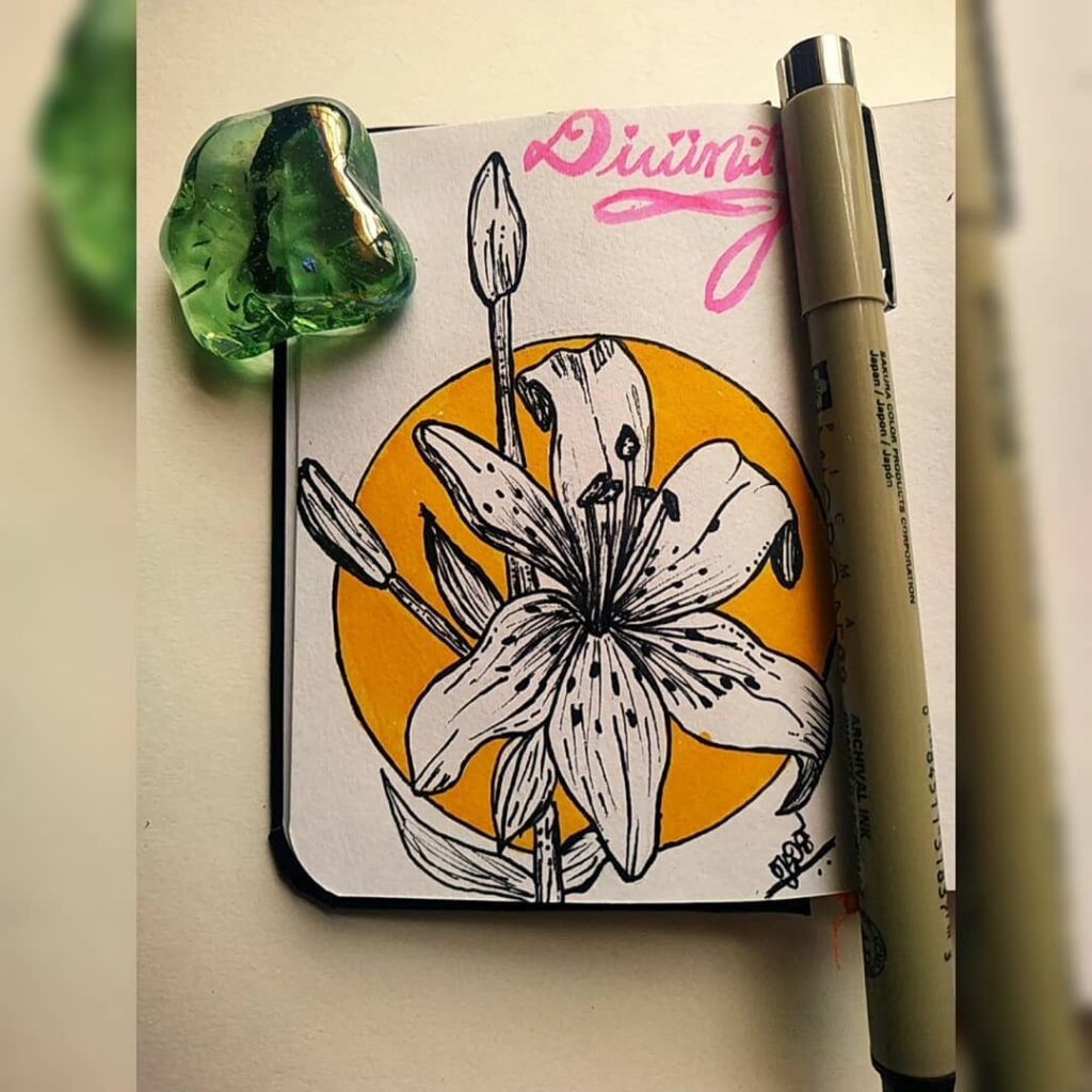 A small lily ink drawing with a glowing yellow background circle. It’s a perfect idea for sketchbook lovers who enjoy minimal art with a little color.