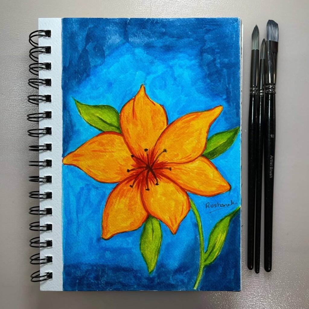 This bright orange lily painting shines against a deep blue background. It’s perfect for beginners who want to try bold colors and contrast.