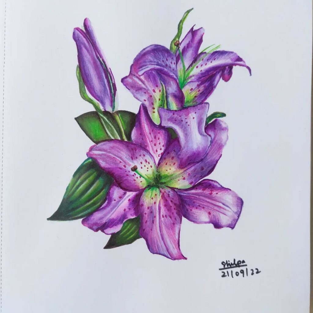 This elegant purple lily drawing is full of soft details and gentle color blending. The green leaves and deep purple petals look lovely together.