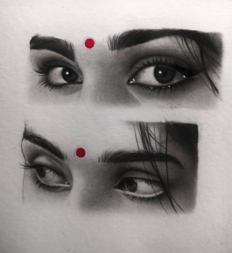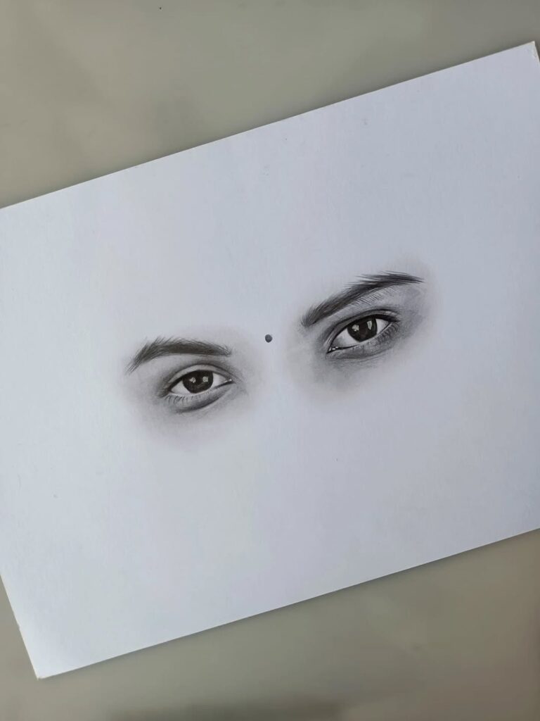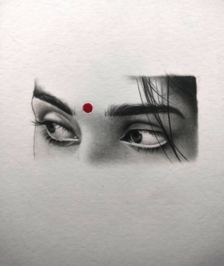 A calm and realistic drawing showing gentle eyes with a red bindi. Smooth shading gives a soft, dreamy look.