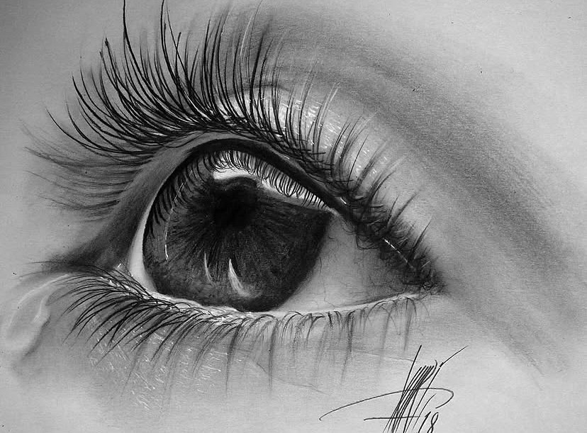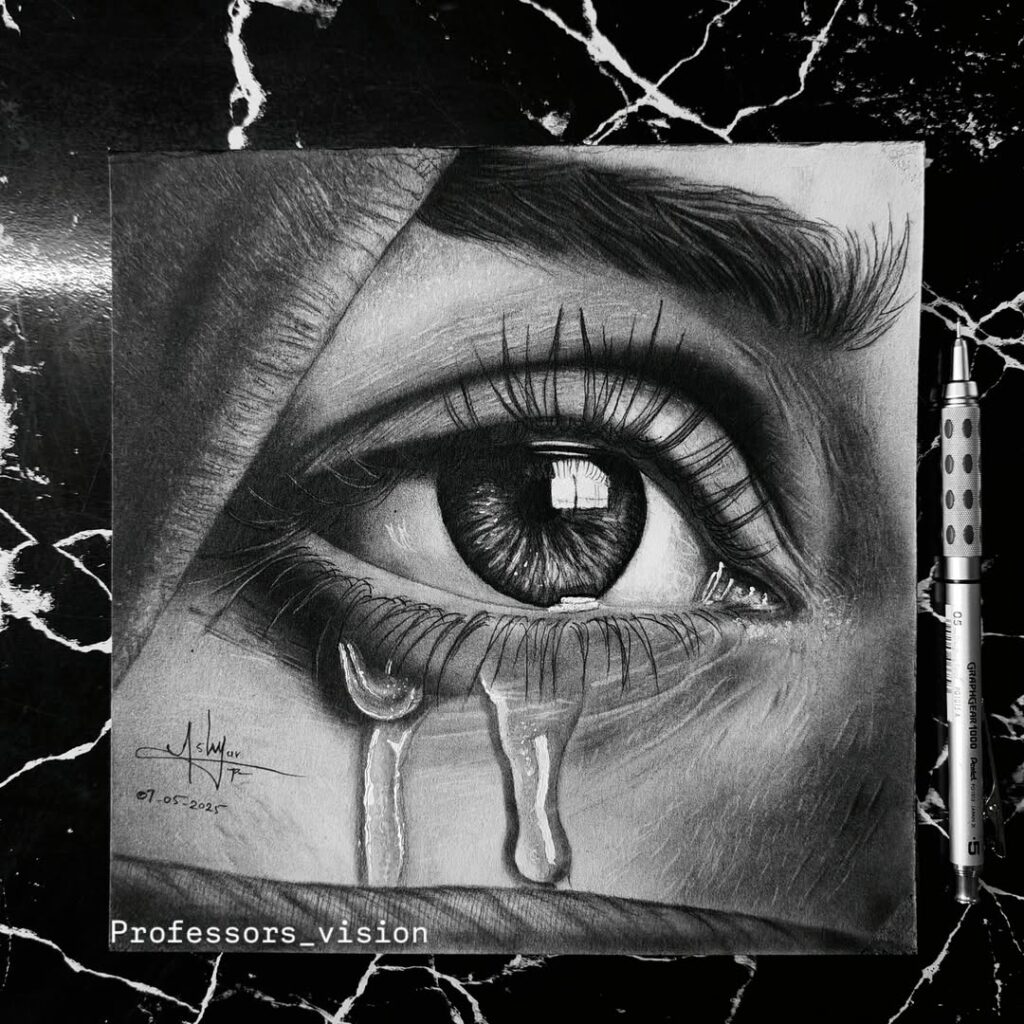 A realistic teardrop falling from the eye. The soft pencil work makes it look alive.