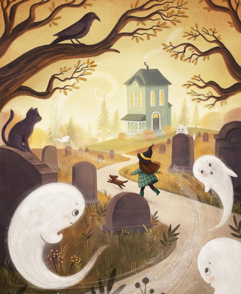 A little witch walks through a graveyard with playful ghosts floating around. The scene glows in warm fall light with soft golden trees and spooky charm.