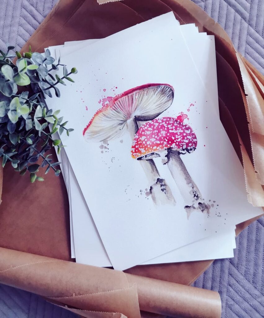 Two red and white mushrooms drawn in watercolor with soft splashes. The design is simple yet artistic, showing the cozy forest side of fall.