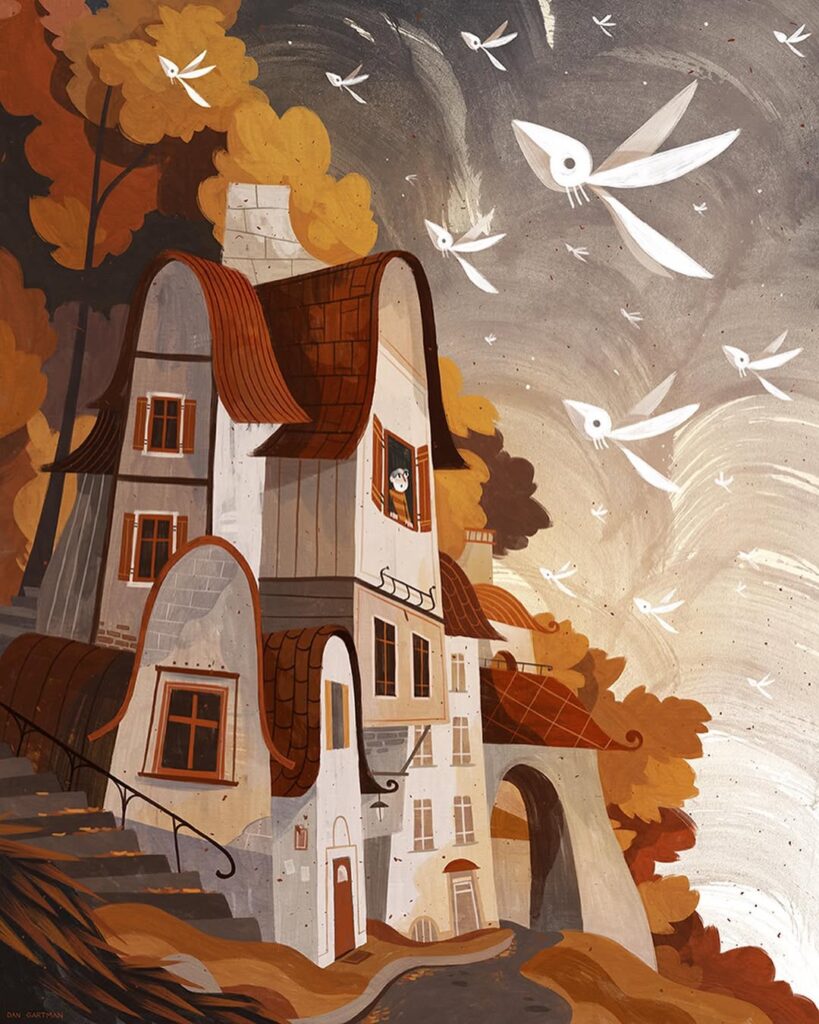 A curved, storybook-style cottage surrounded by orange trees and flying white birds. The painting feels dreamy and warm, just like a fall fairytale.