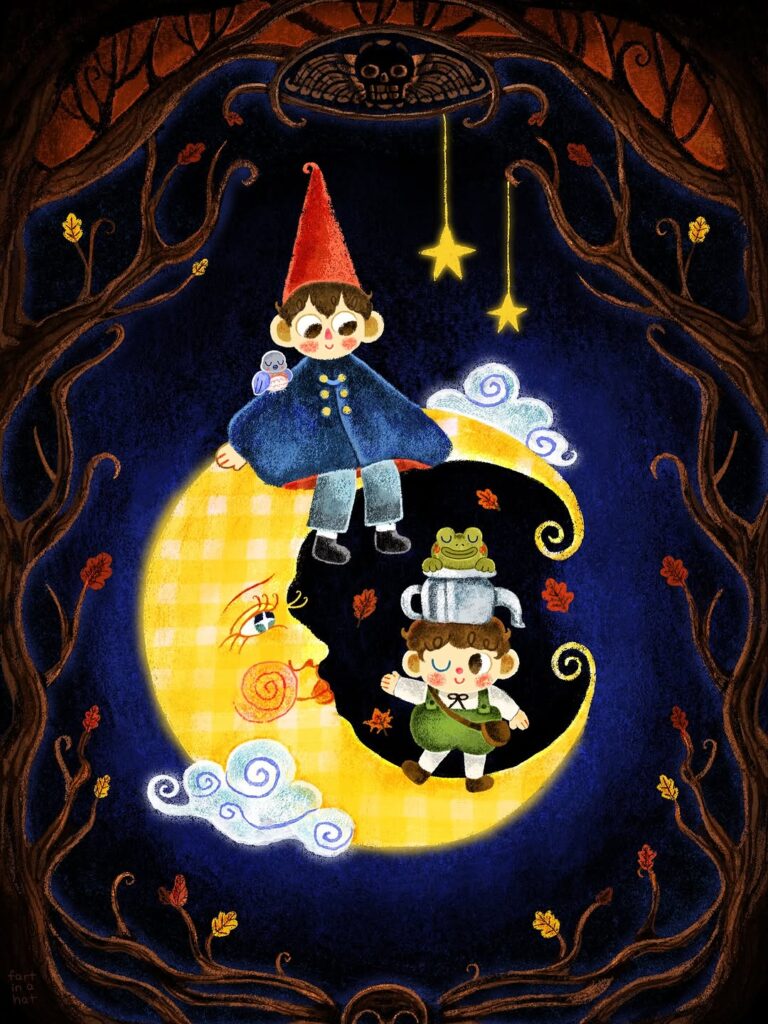 Two cute characters sit on a glowing yellow moon surrounded by stars and twisted tree branches. The dark blue background makes the warm moonlight shine.