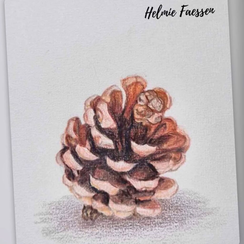 A soft colored-pencil drawing of a pinecone with brown and cream tones. It’s simple but full of texture and shading practice.