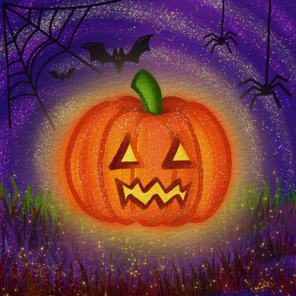 A bright orange jack-o’-lantern glows in a purple night sky with bats, spiders, and glittery effects.