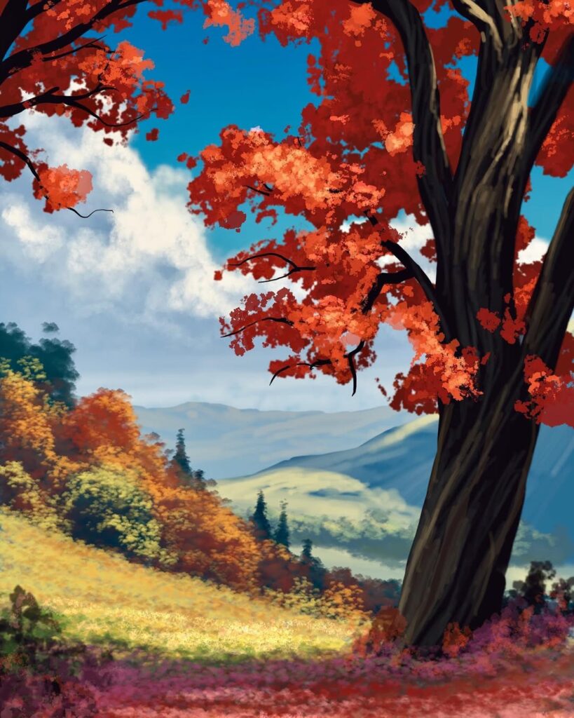 It’s a peaceful fall scene that captures nature’s beauty—great for artists who enjoy painting autumn forests and colorful trees.