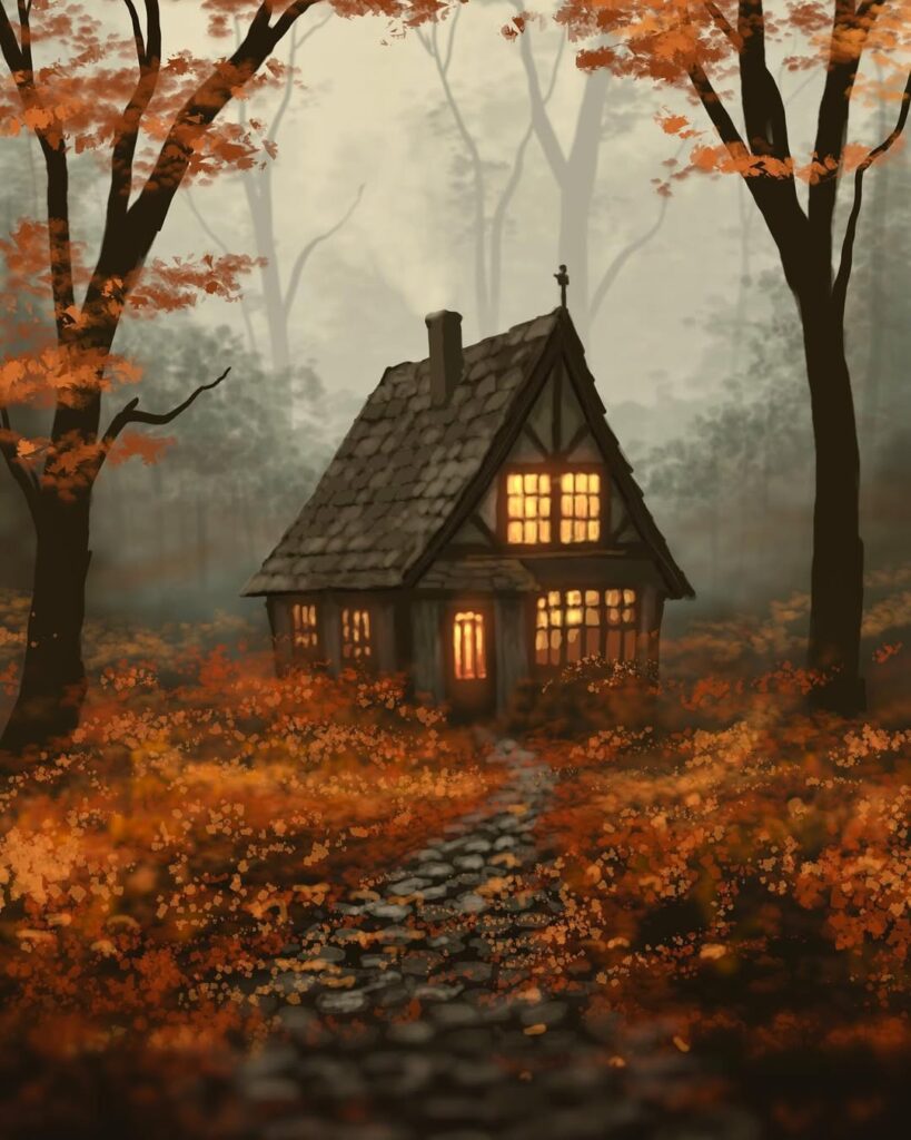A warm, glowing house sits deep in a foggy autumn forest, surrounded by orange leaves.