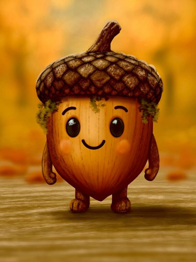 A cute smiling acorn character stands on a soft wooden surface. Its big eyes and blush make it look friendly and warm.