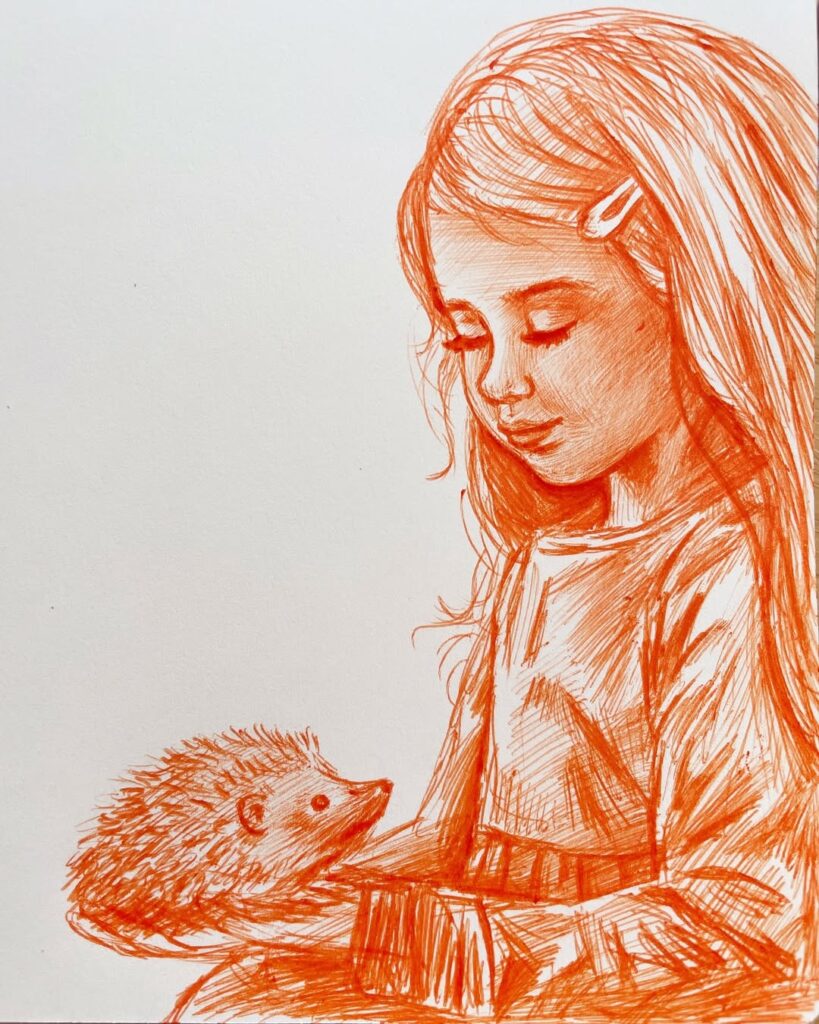 A soft sketch of a girl holding a tiny hedgehog in her hands. Both look calm and gentle.