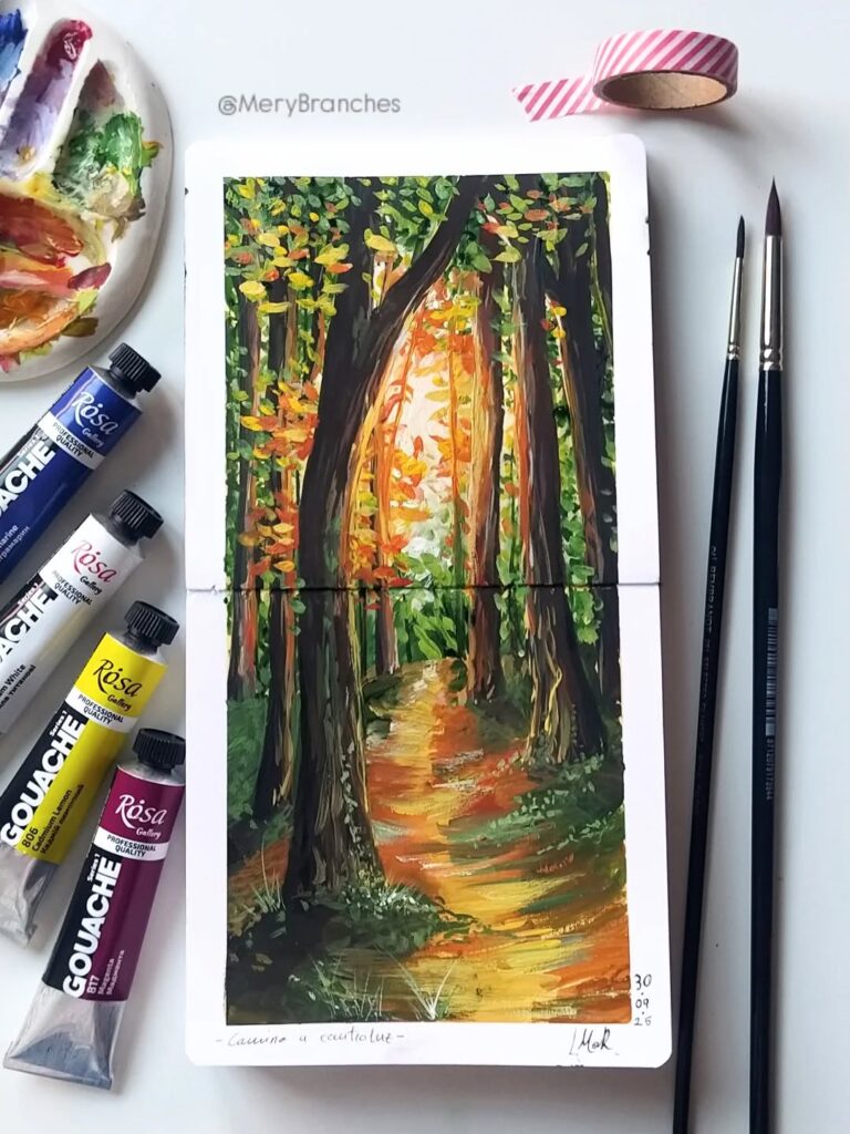 The sunlight shines through, making the forest look magical. It’s a great fall drawing idea for practicing depth, color, and light using gouache or watercolor.