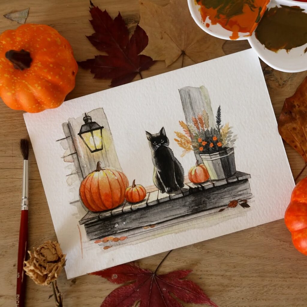 This drawing is simple and relaxing to create, perfect for fall art lovers who enjoy painting cozy Halloween scenes.