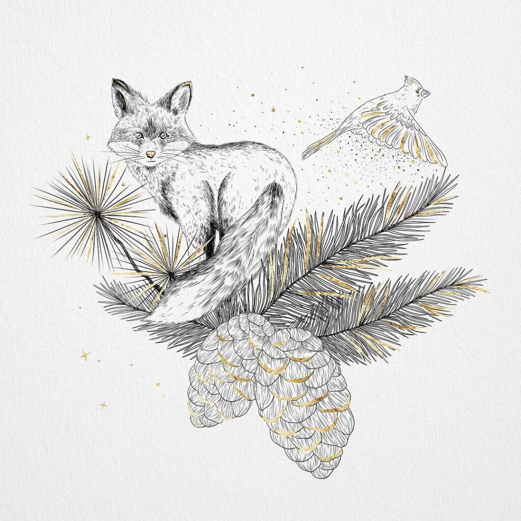 A fox stands proudly among pine branches and cones, with a bird flying nearby. The fine lines and touches of gold make it elegant and soft.
