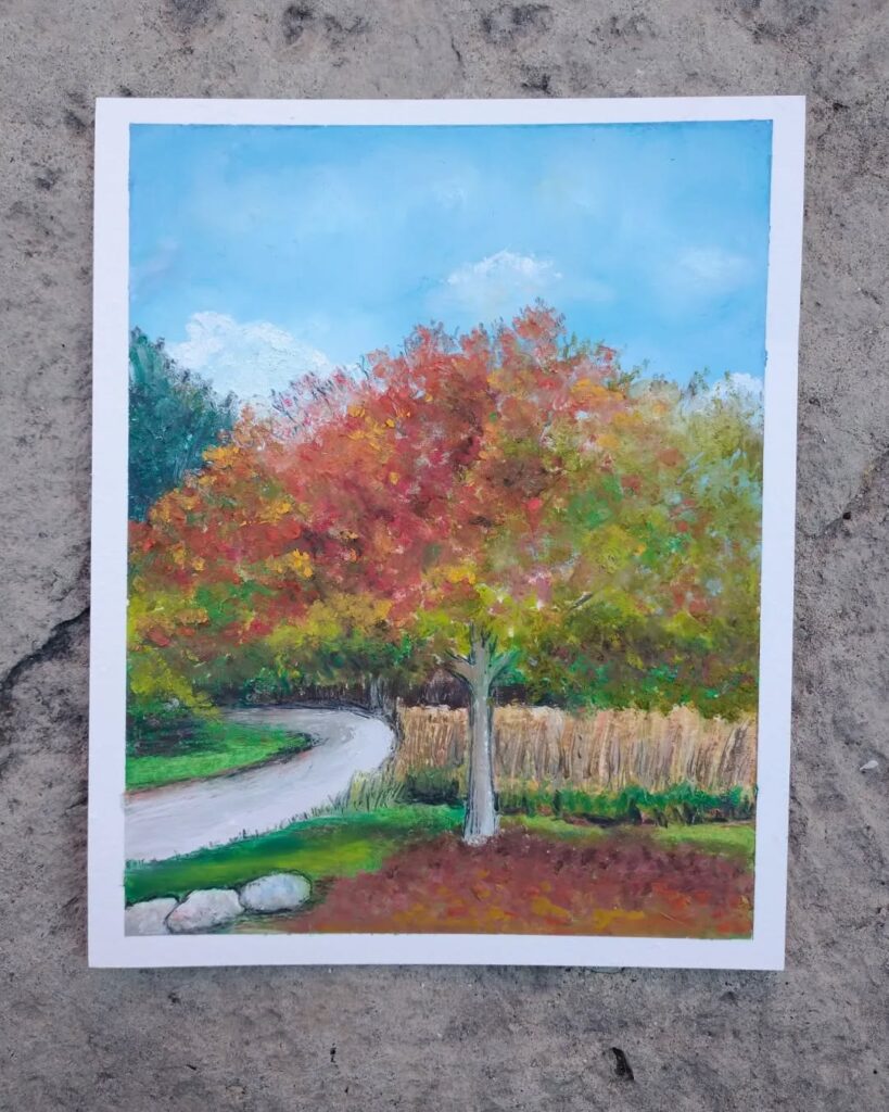 It’s a perfect idea for beginners to practice perspective, shading, and fall colors using acrylics or watercolors.