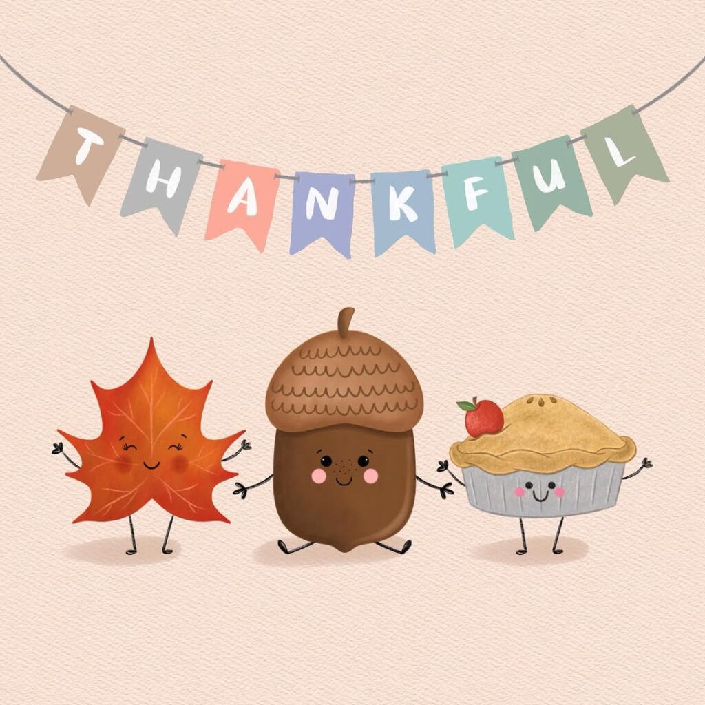 A smiling leaf, acorn, and pie hold hands under a “THANKFUL” banner. Their cute faces and soft pastel colors create a joyful fall mood.