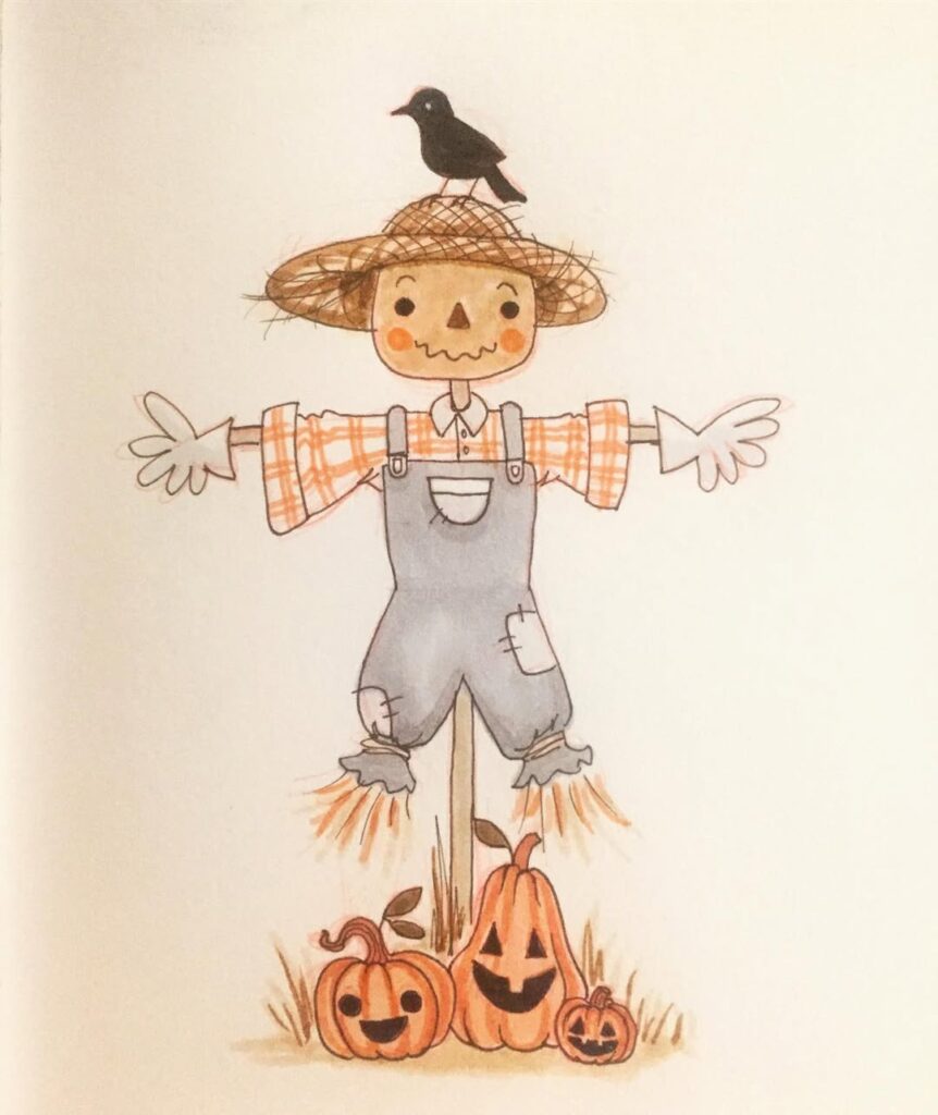 A cute scarecrow with a straw hat and overalls stands with happy pumpkins below. A small bird rests on its head.