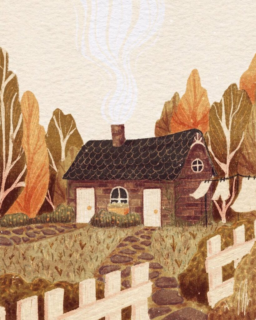 This drawing beautifully combines gentle storytelling, cozy autumn colors, and calm countryside charm.