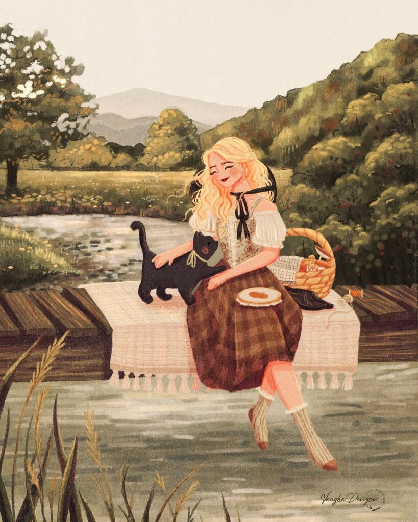 A peaceful fall illustration of a girl sitting by a river with her black cat. Surrounded by golden trees and soft sunlight, the scene feels warm and nostalgic.
