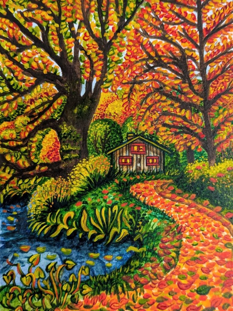 A bright and lively fall forest drawing with a colorful pathway leading to a tiny cabin.
