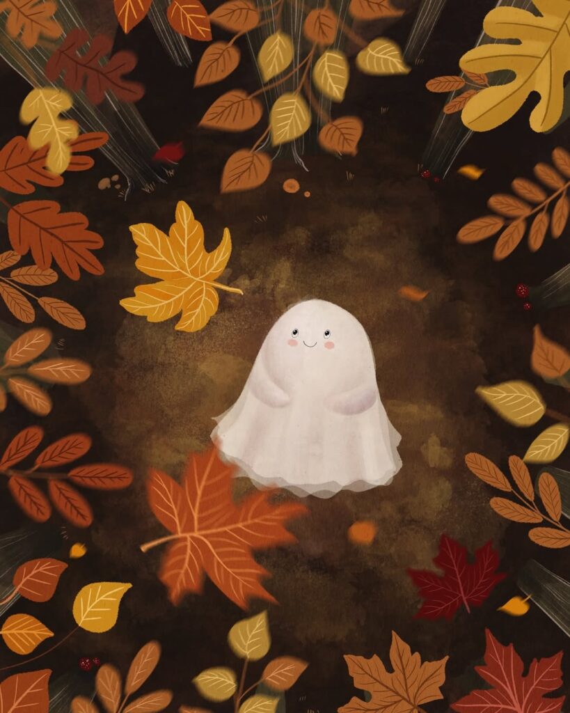 A happy little ghost stands among falling orange and yellow leaves on a dark forest floor.