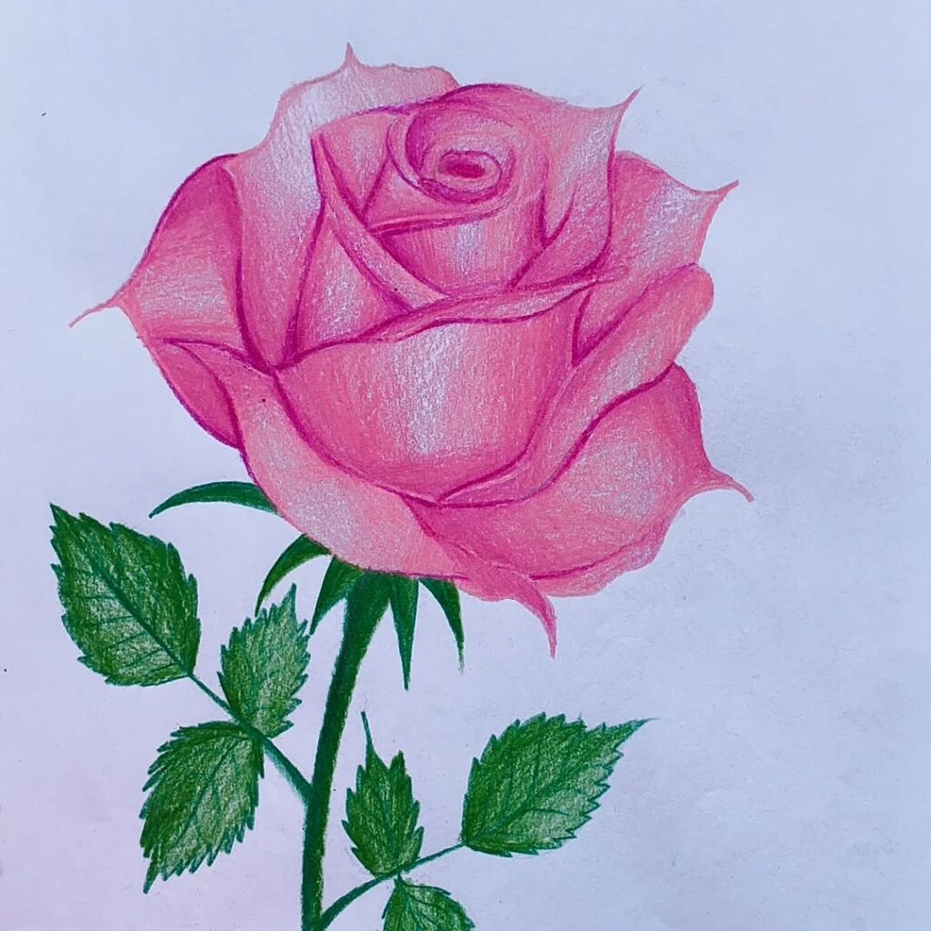 A beautiful pink rose with bright green leaves. The pencil colors bring it to life.