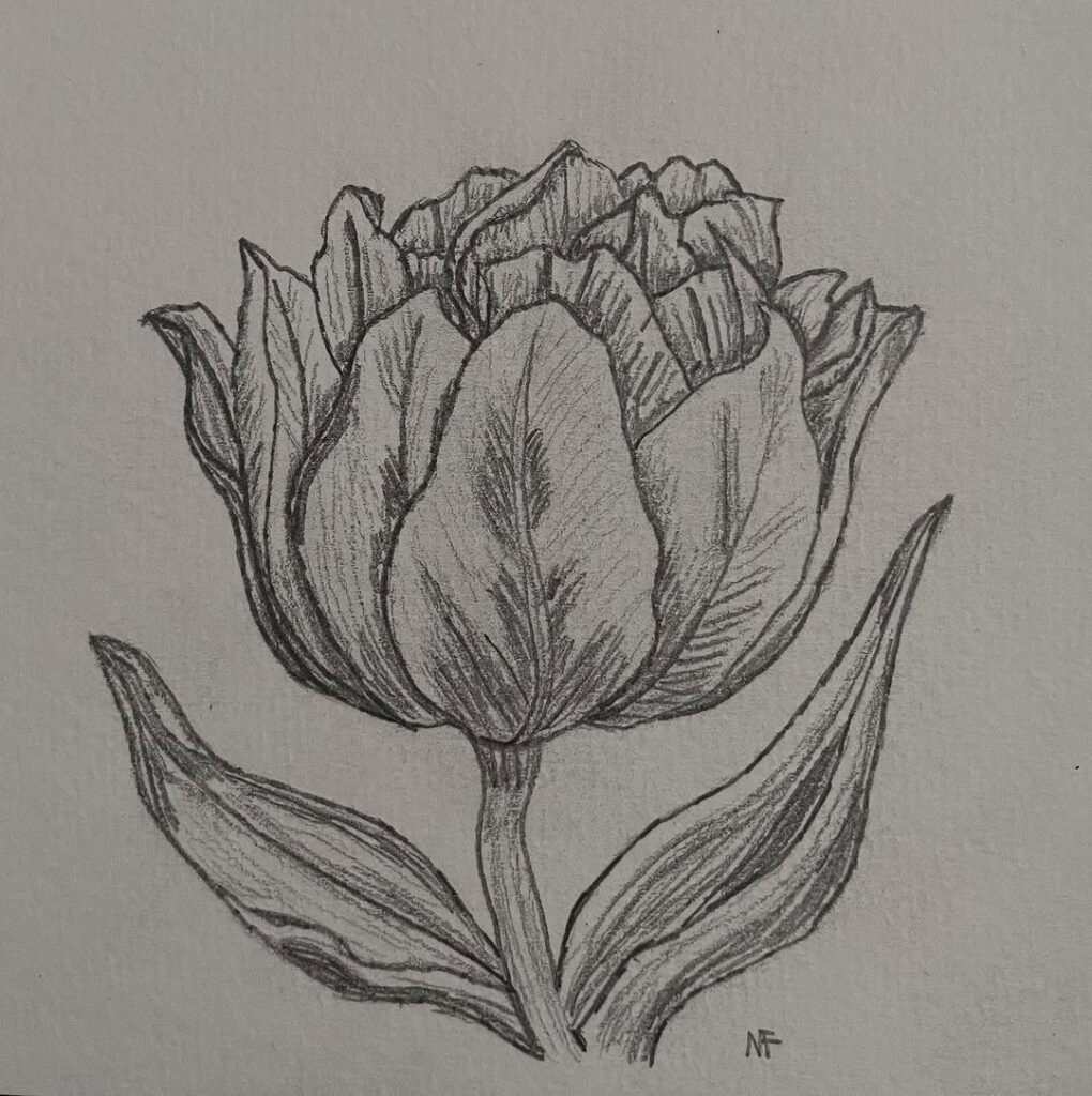 A soft pencil drawing of a tulip. The simple shading gives it texture and shape.