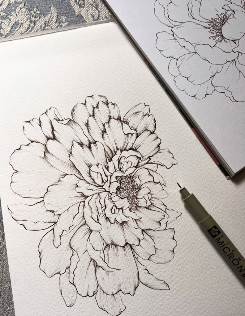 A large peony drawn with fine ink lines. The soft curves and tiny details make it look delicate.