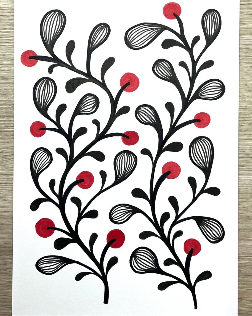 A simple, modern flower pattern using black and red. The bold lines and shapes look fun and creative.
