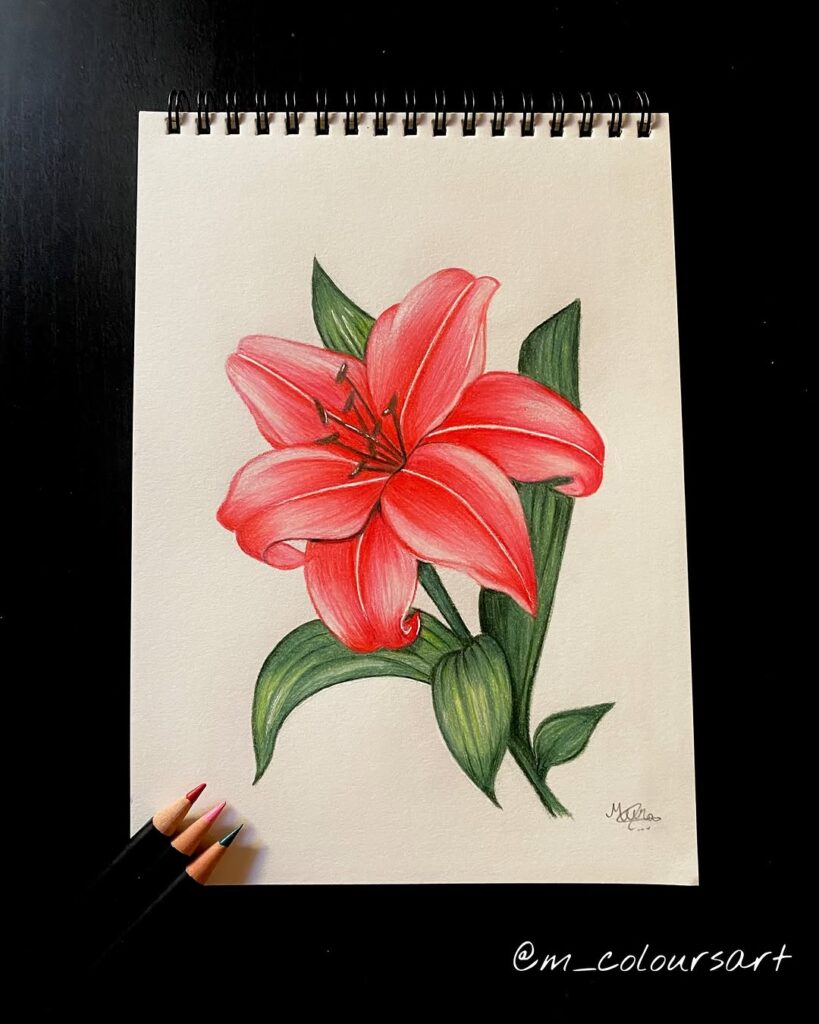 A bright red lily drawn with colored pencils. The petals look soft and natural, with gentle shading.