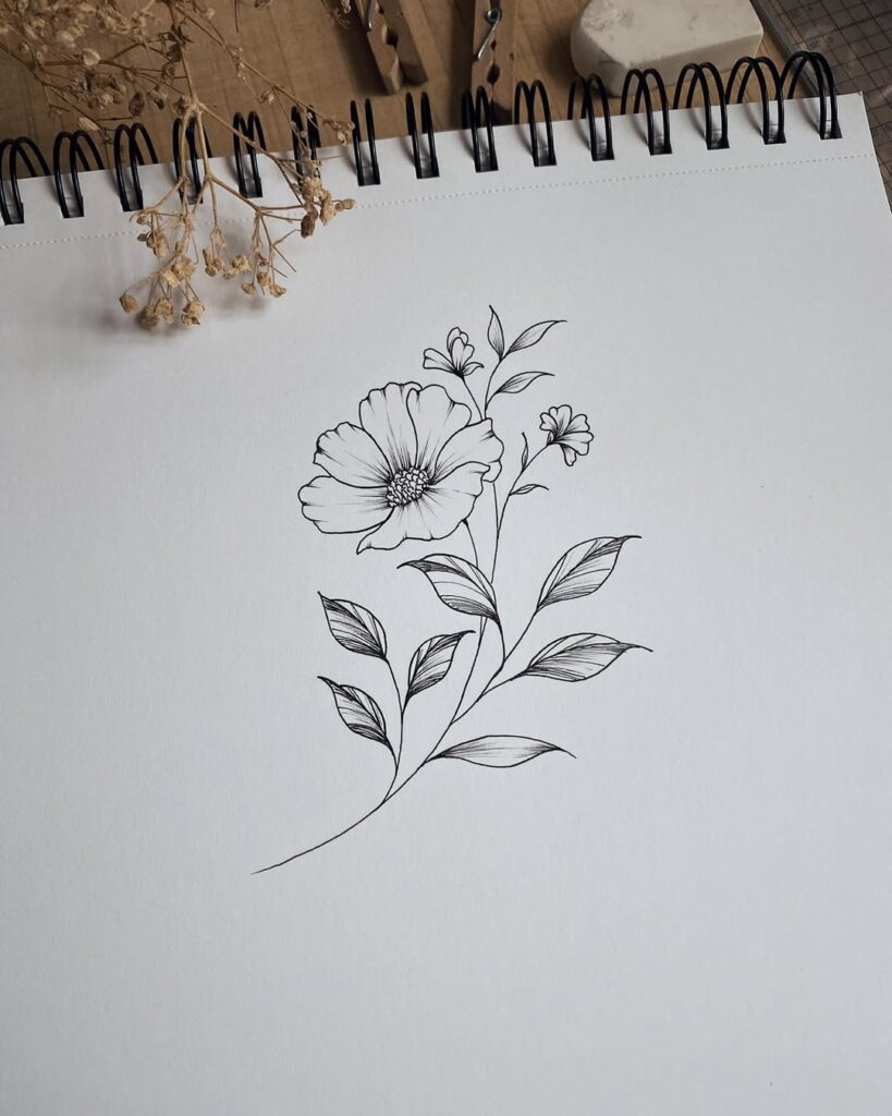 A clean and pretty sketch of small flowers and leaves. The design is gentle and minimal.