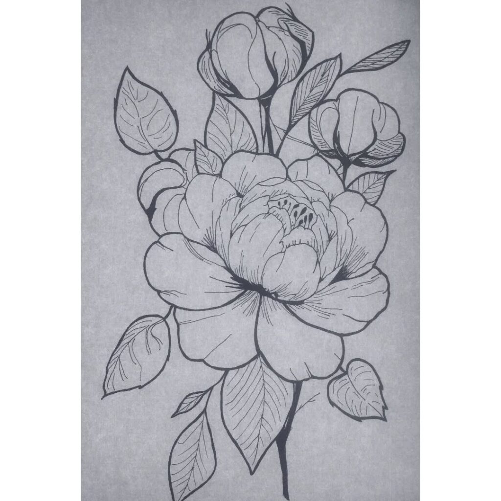 A bold line drawing of large blooming flowers. The strong outlines and layered petals show classic beauty.