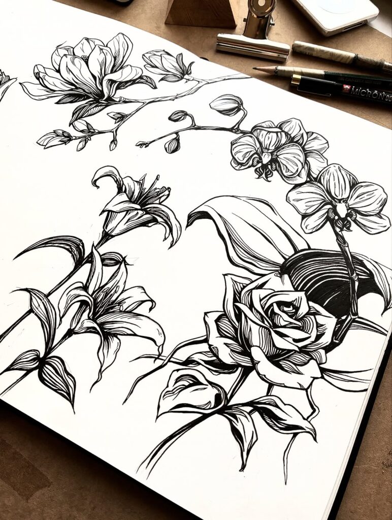 The black ink lines look bold and creative, showing many ways to draw flowers.