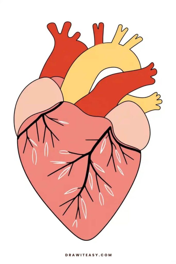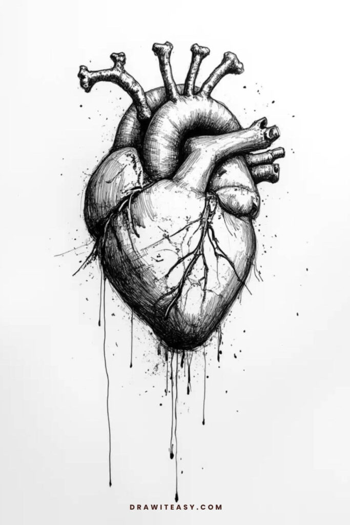 This drawing shows a real human heart with strong sketch lines and ink drips. It feels bold and rough, perfect for learning real heart shapes and adding dramatic style.