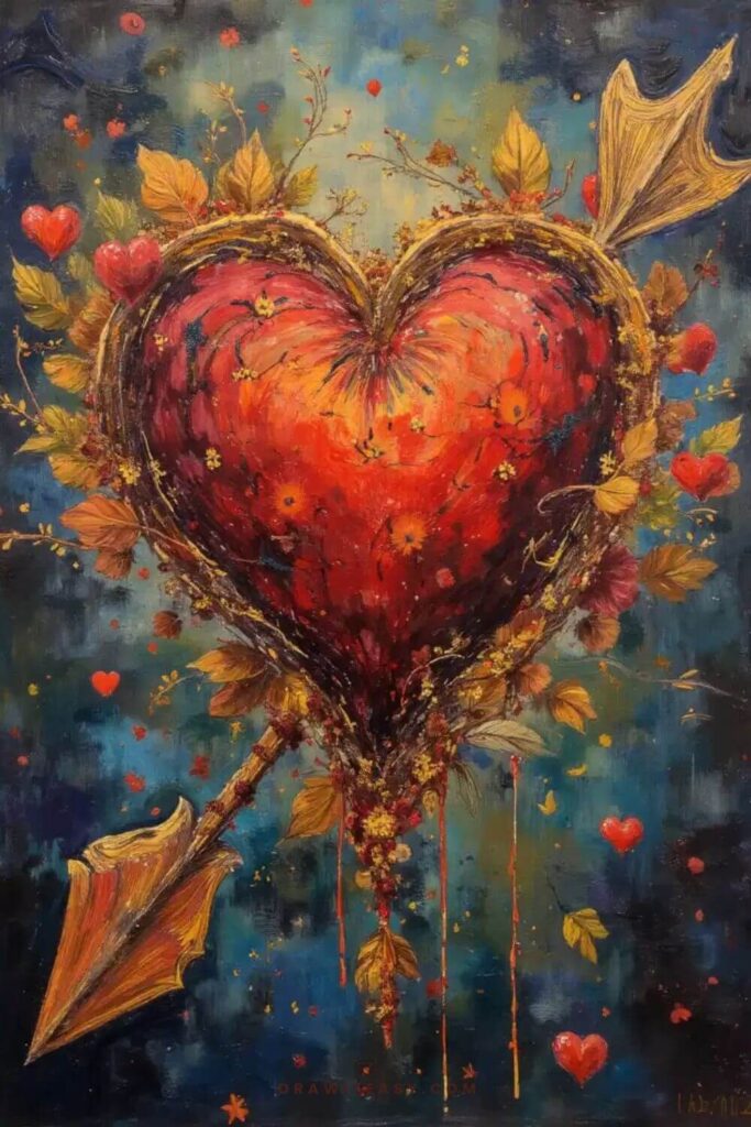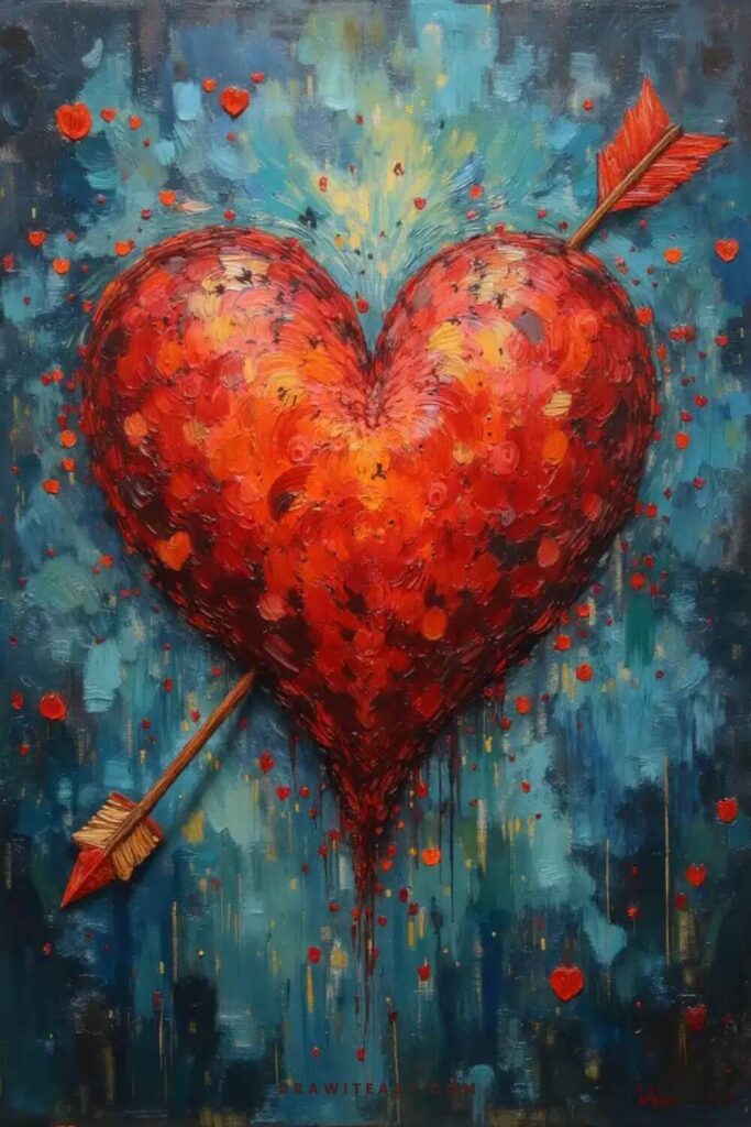 This painting shows a thick, textured heart with bold strokes and glowing red tones. It feels powerful and exciting, great for learning color depth in symbolic heart art.