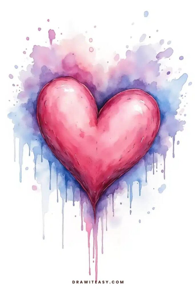 You can see a soft pink heart surrounded by blue and purple watercolor. It creates a dreamy feeling and is easy to copy for gentle symbolic love drawings.