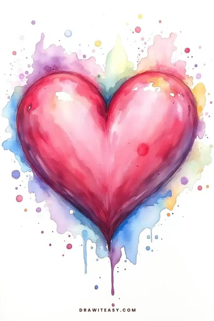 This heart has bright colors exploding around it in watercolor splashes. It feels fun and happy, great for beginners wanting a bold symbolic heart with simple shapes.