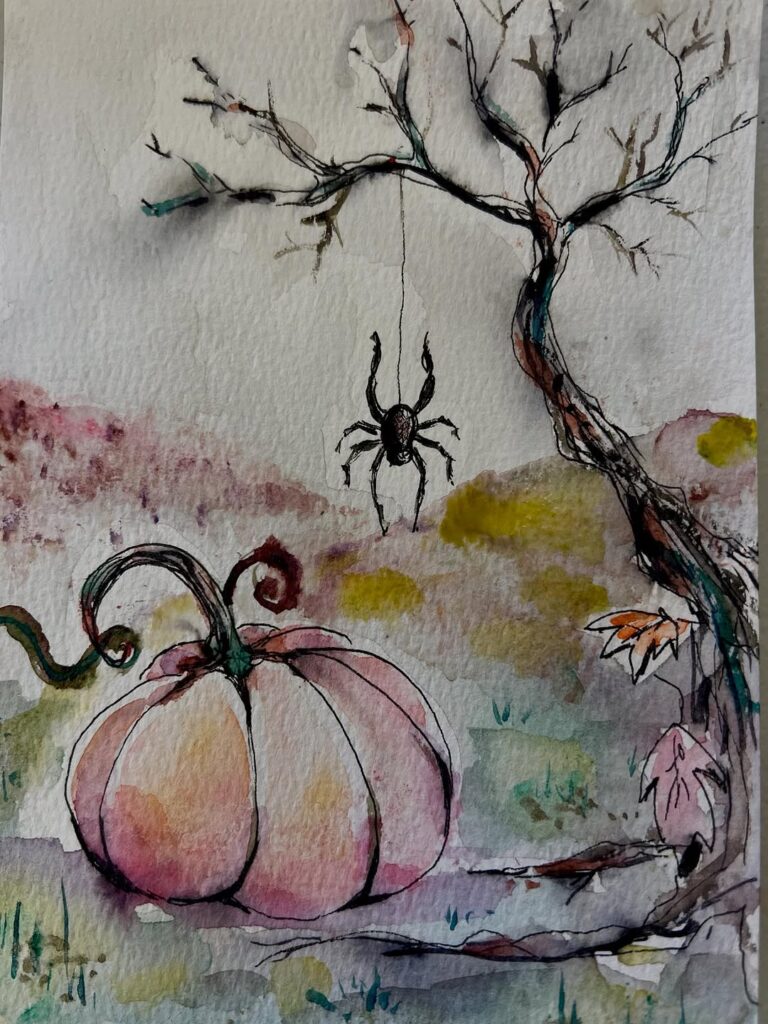 A soft watercolor pumpkin sits near a bare tree with a spider hanging down.