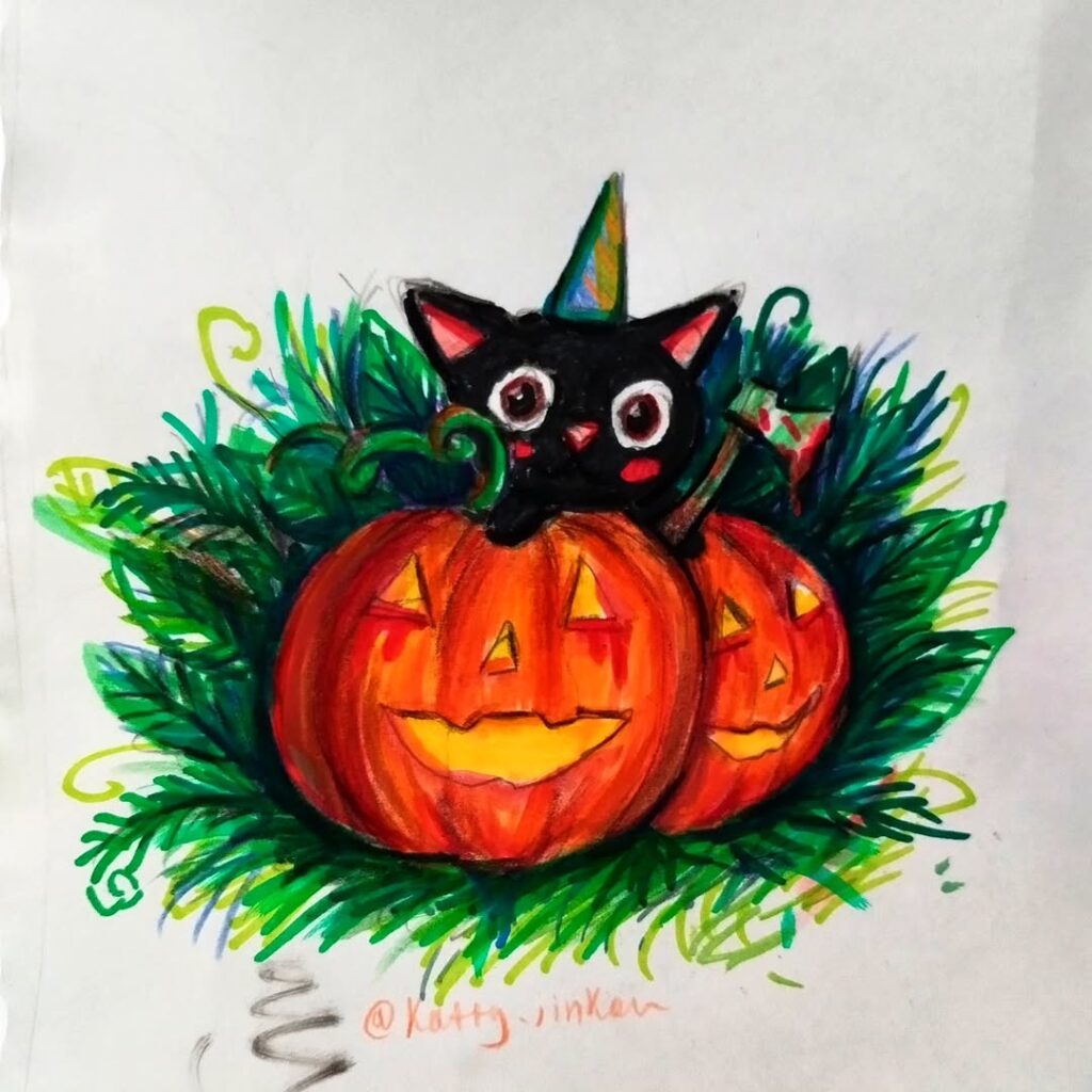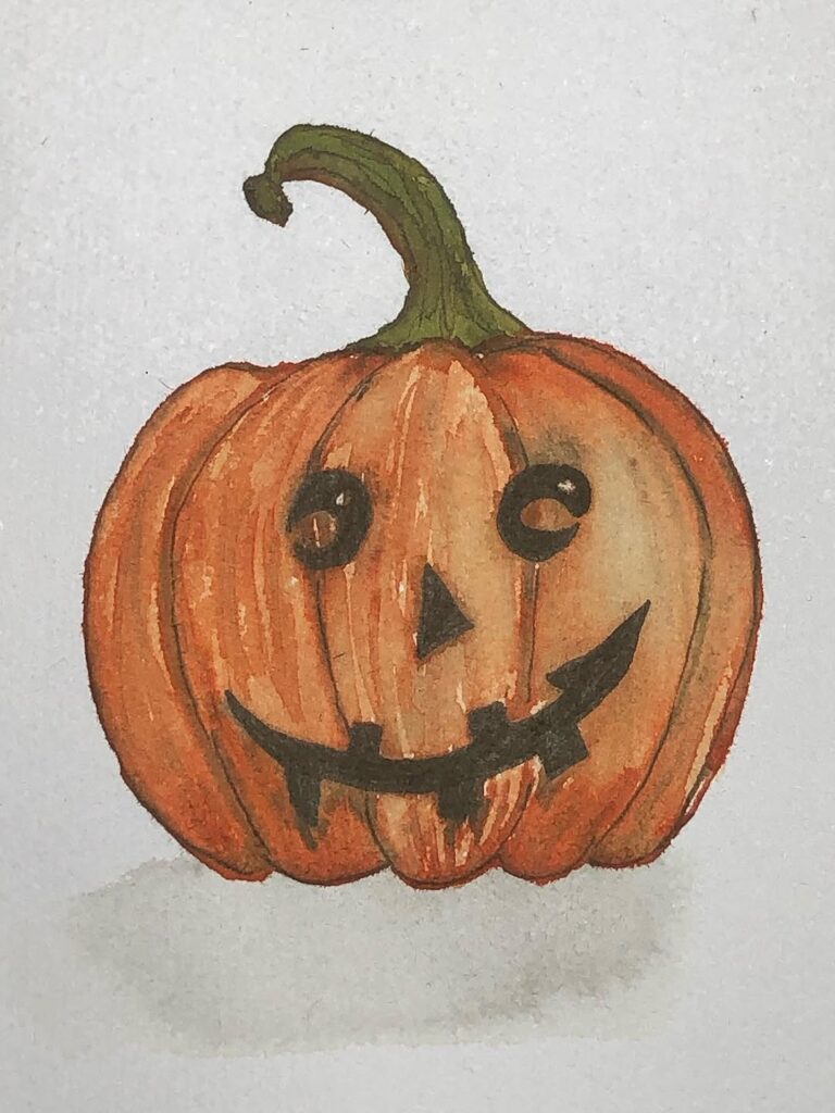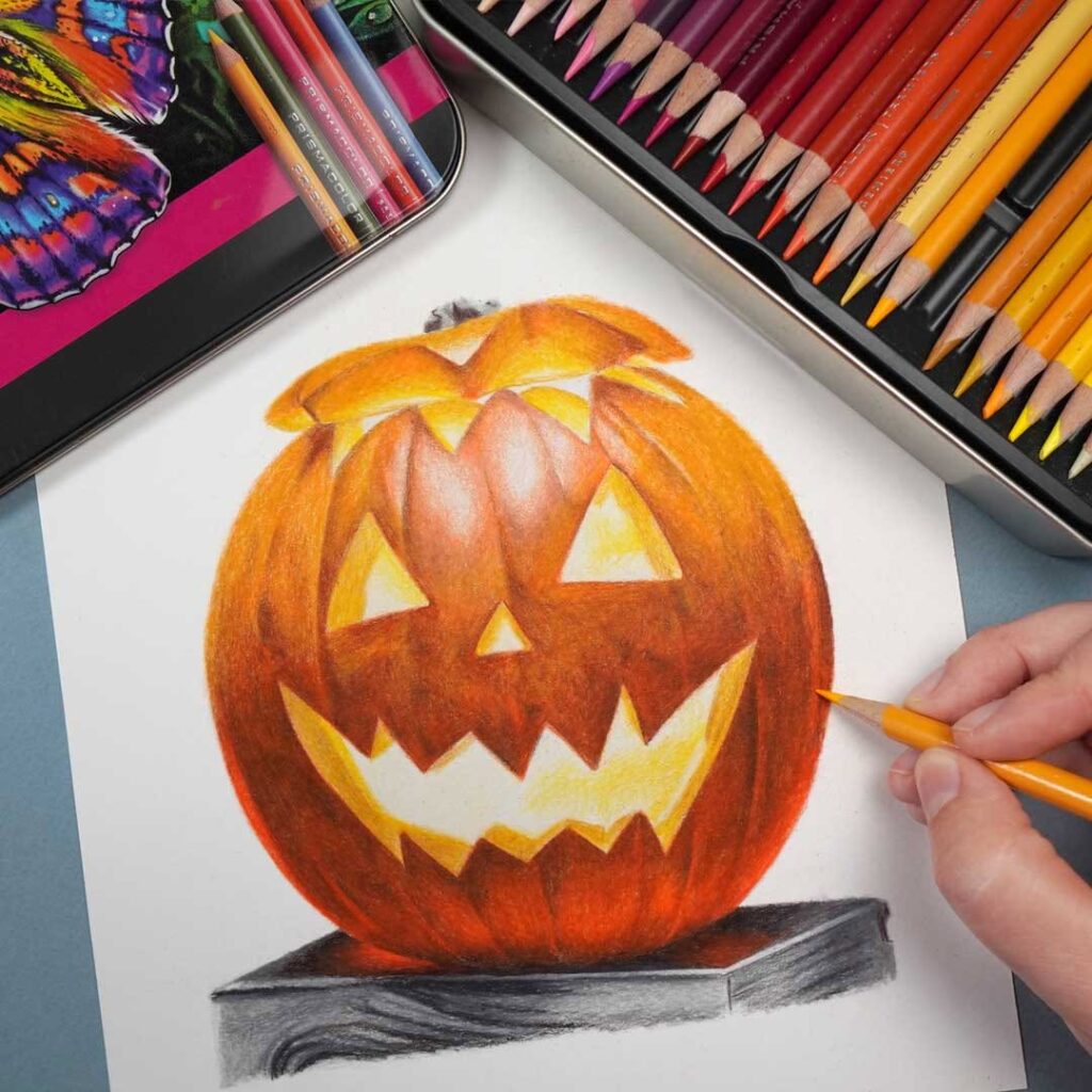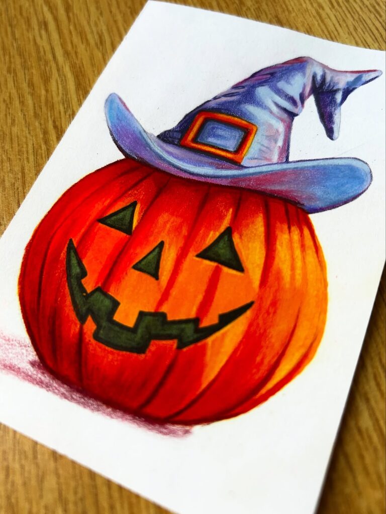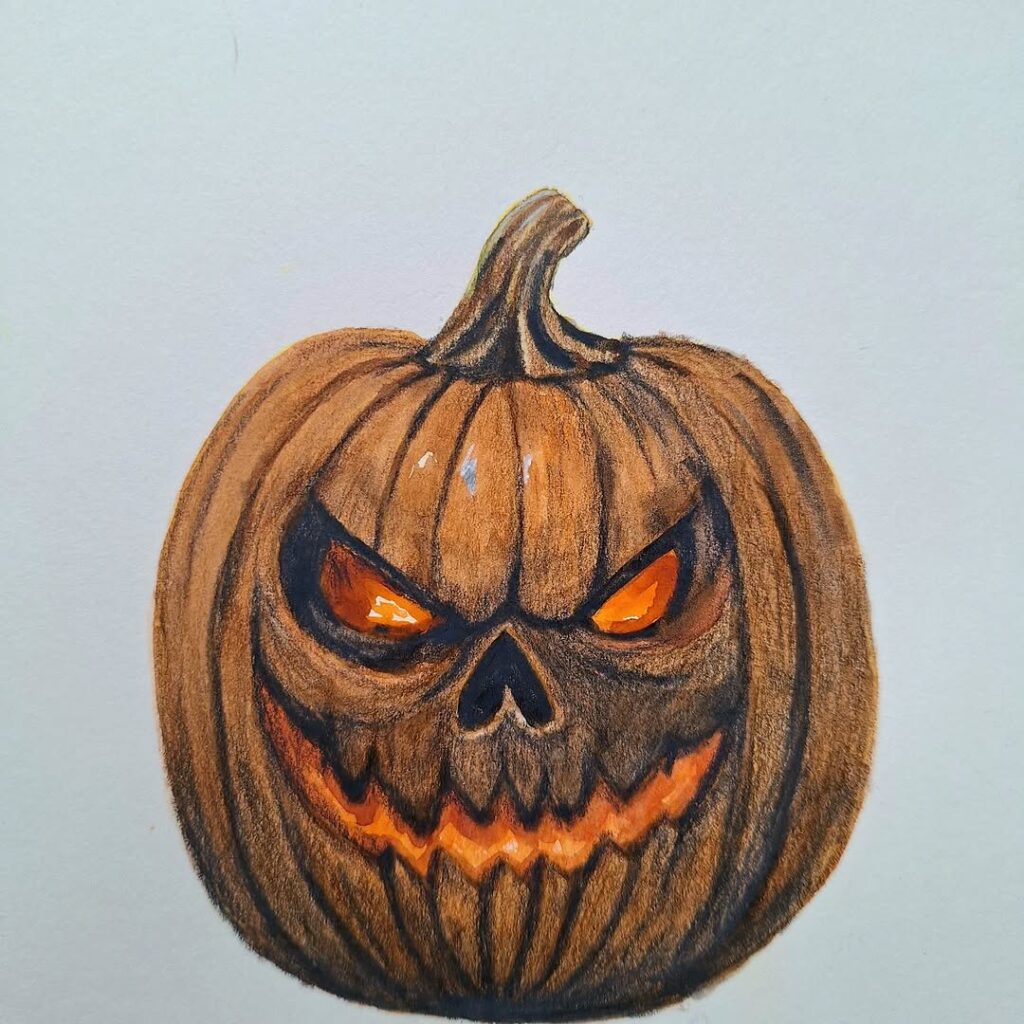A bright, glowing pumpkin with sharp teeth and big eyes. It’s drawn with colored pencils, perfect for Halloween art ideas.