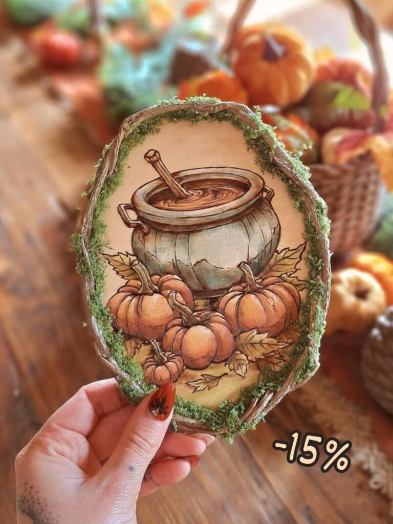 A hand holds a wooden art piece with pumpkins and a pot surrounded by moss. The warm tones make it feel cozy and magical.
