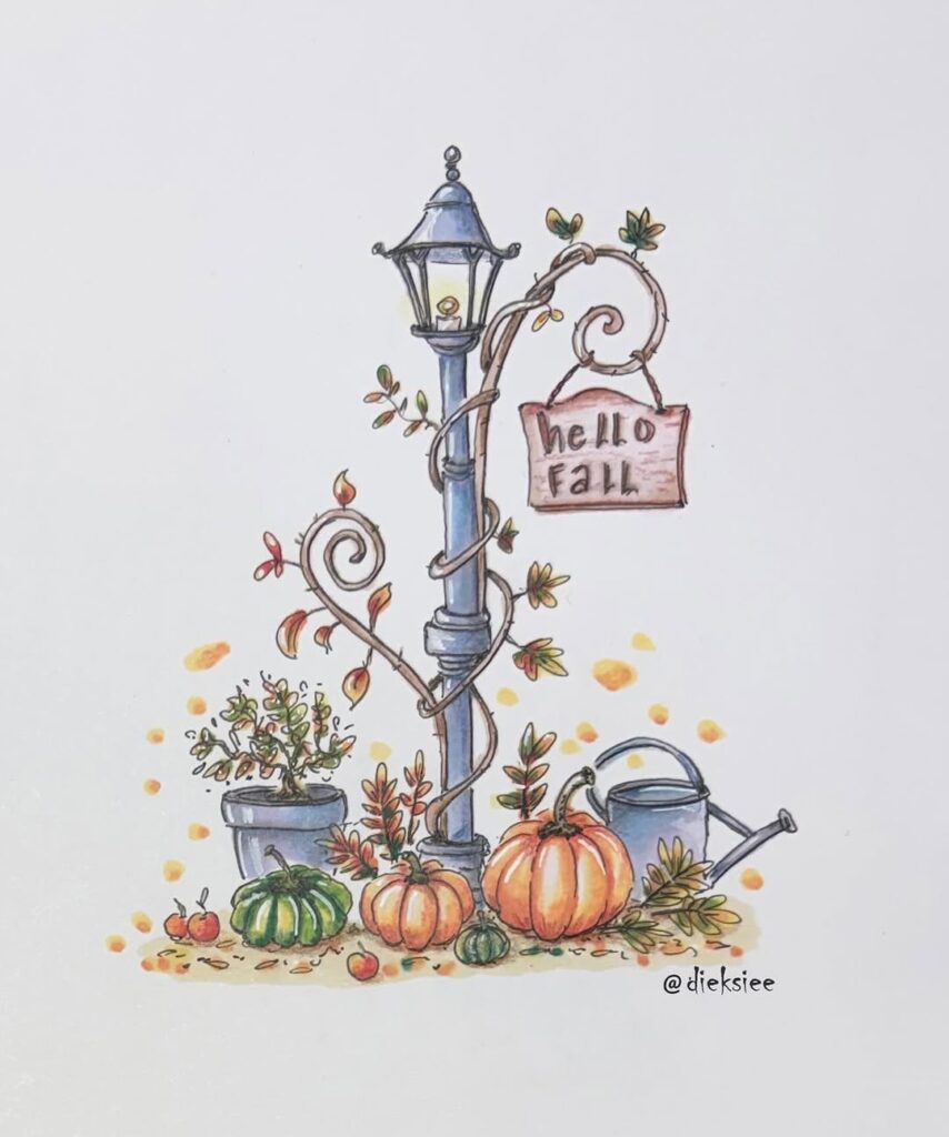 A sweet fall scene with pumpkins under a lamppost that says “hello fall.” It’s colorful and whimsical, perfect for seasonal drawing inspiration.