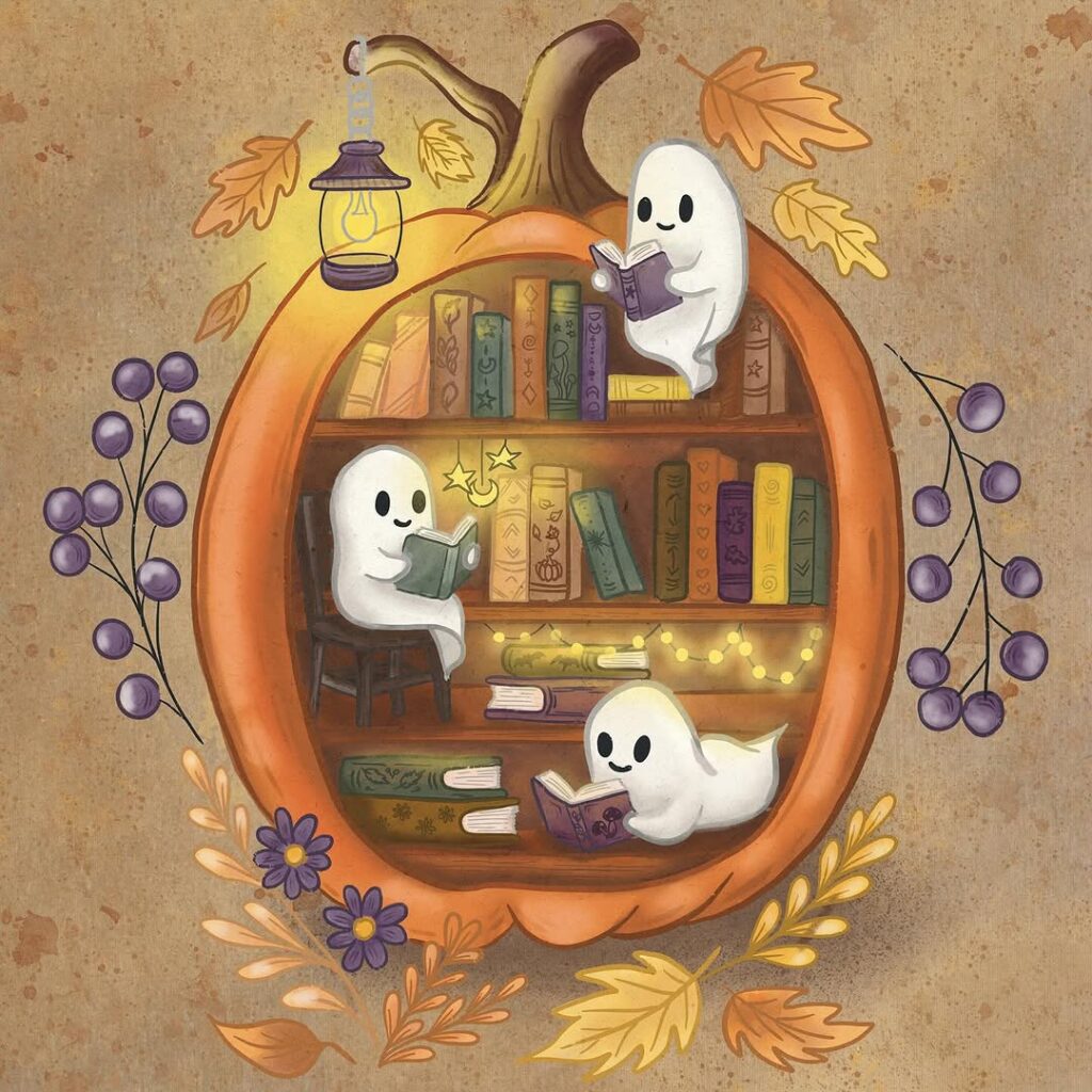 Cute little ghosts read books inside a pumpkin-shaped bookshelf. It’s cozy, creative, and full of Halloween charm.
