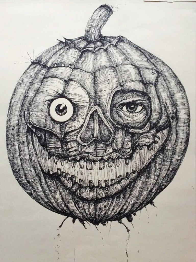 A detailed black ink pumpkin with scary eyes and a skull-like face. It’s spooky and artistic, great for advanced sketchers.