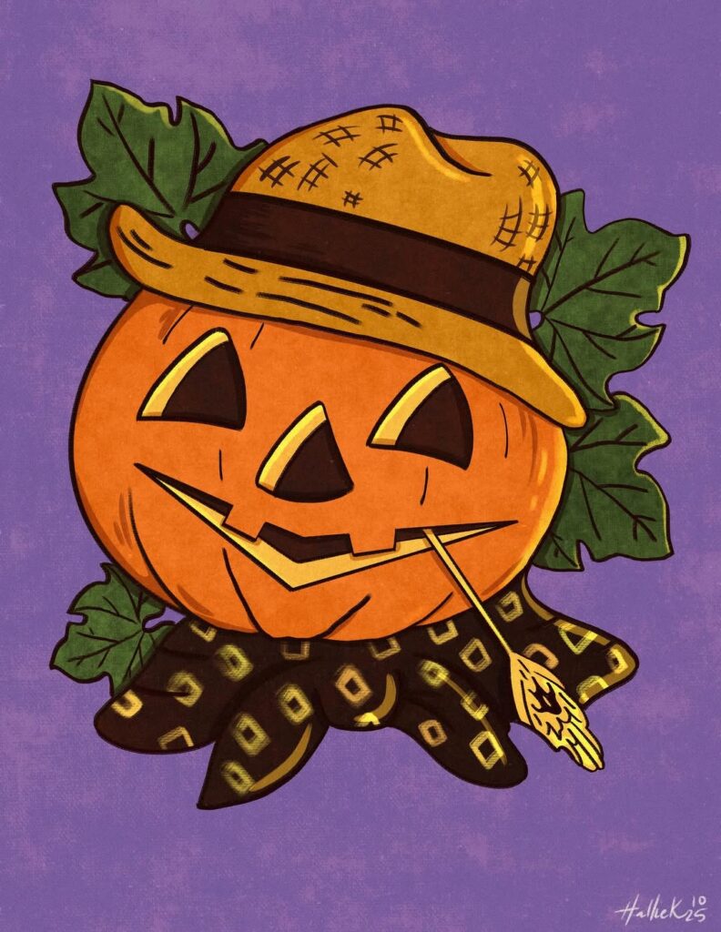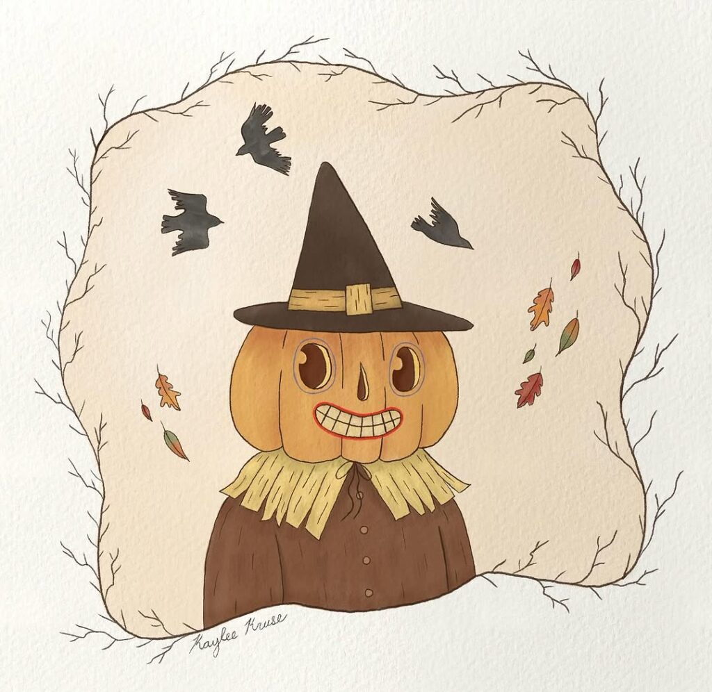 A pumpkin-headed scarecrow wearing a witch hat stands among falling leaves and flying crows. It’s spooky but still cute for fall art.