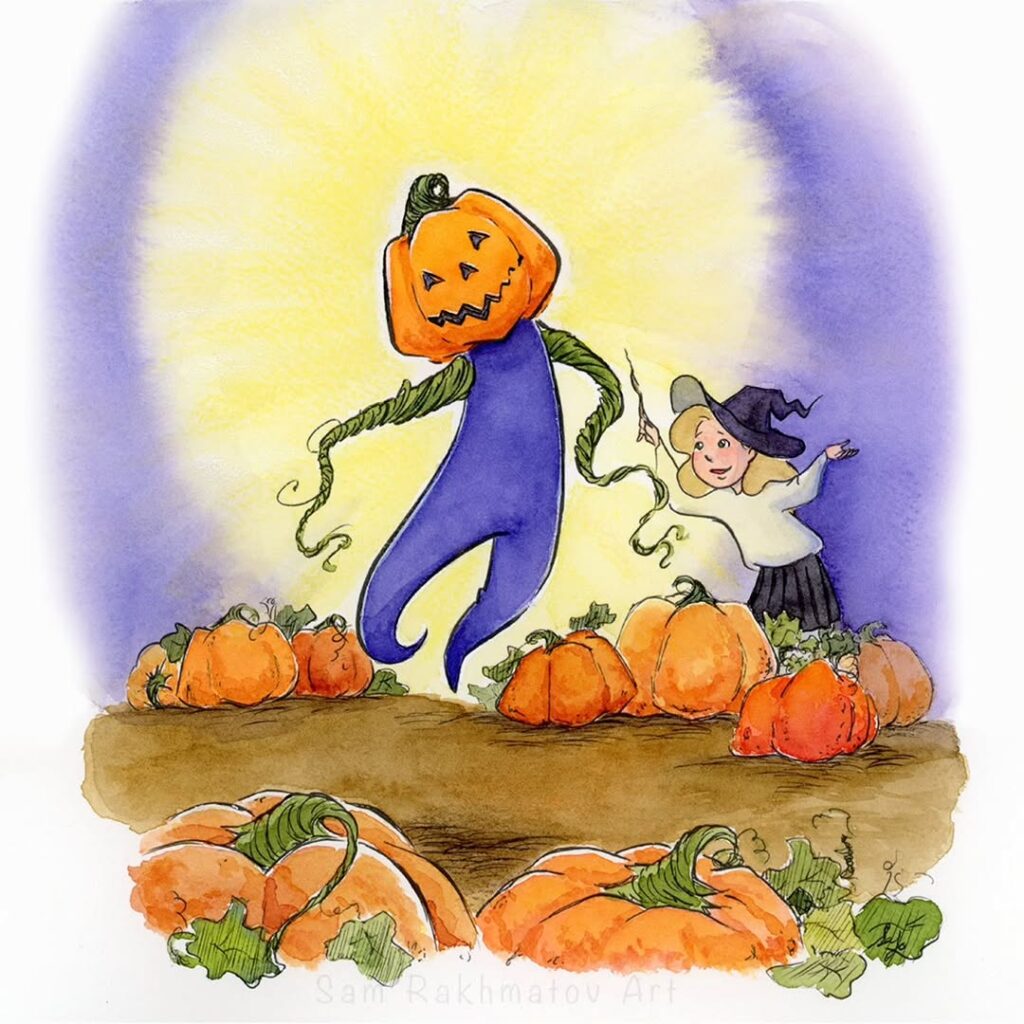 A cute witch brings a pumpkin scarecrow to life under bright yellow light. The fun and playful scene feels full of fall magic and imagination.
