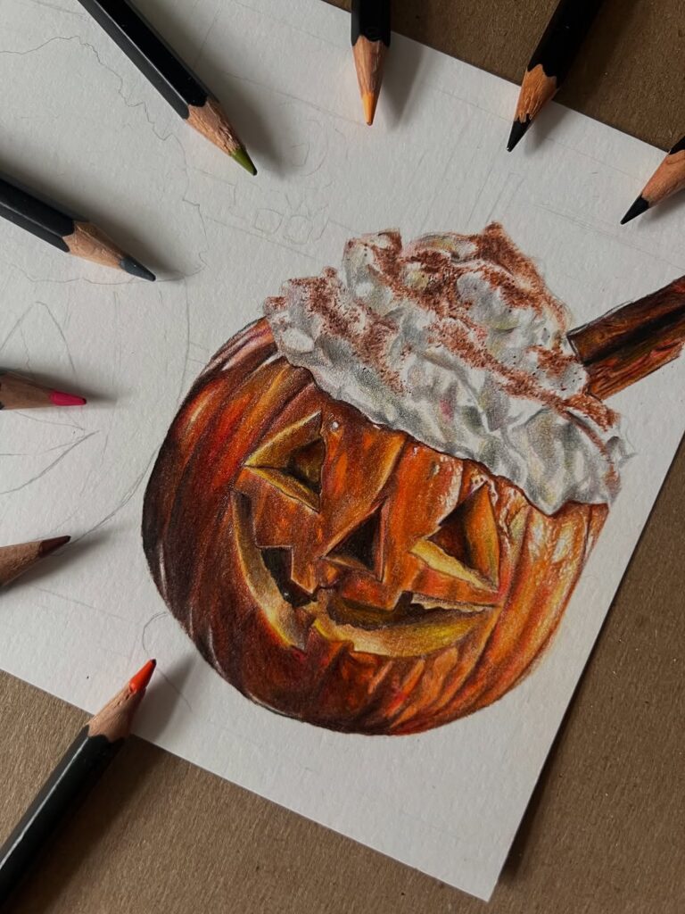 A detailed drawing of a pumpkin with whipped cream on top, looking like a pumpkin spice latte. Warm colors make it cozy and deliciously autumn.