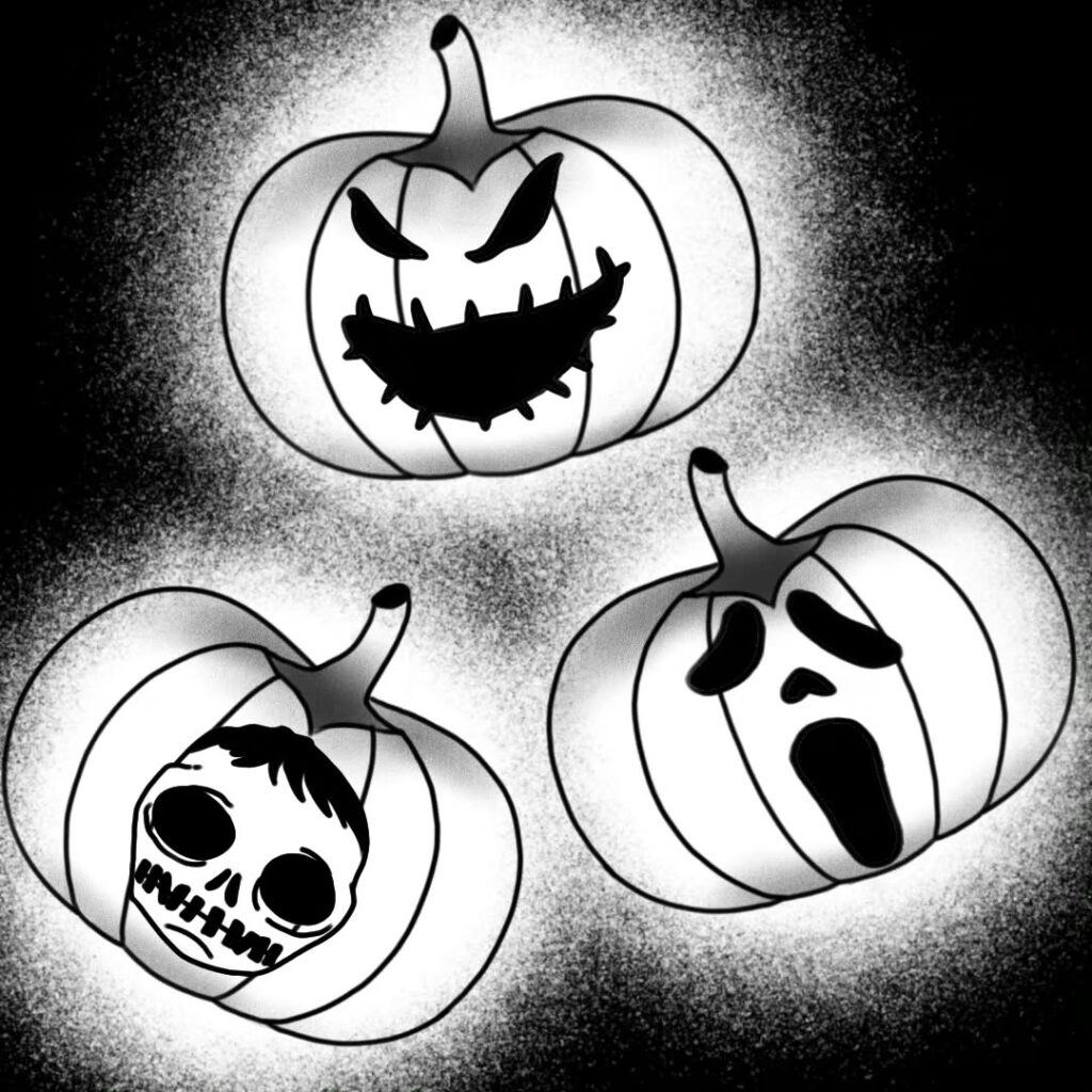Three pumpkins with creepy faces glow in black and white. Each one shows a different spooky expression, perfect for a Halloween-style art idea.